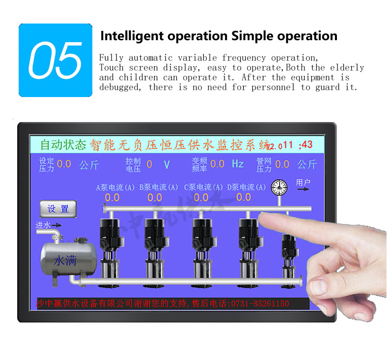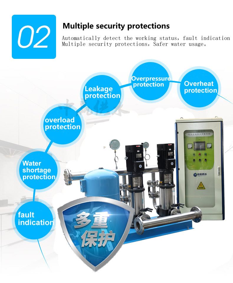 Variable frequency constant pressure water supply equipment by air pressure tank, pump and electric control system is composed of three parts, its outstanding advantage is, no need to build the tower, a small investment and land occupation, flexible layout, fast completion. In the frequency conversion constant pressure water supply equipment using automatic regulation of water and gas, automatic operation, energy saving and tap water automatically connected to the grid, the power supply is still available after the water, no need to monitor after debugging. Constant pressure water supply technology advanced, constant pressure, convenient operation, reliable operation, saving energy, high degree of automation, widely used in enterprise units, residential areas and rural production, living, office water supply. Suitable for water supply households in 5000 households, the daily water supply in 3000m3 places, the water supply height of more than 100 meters.
