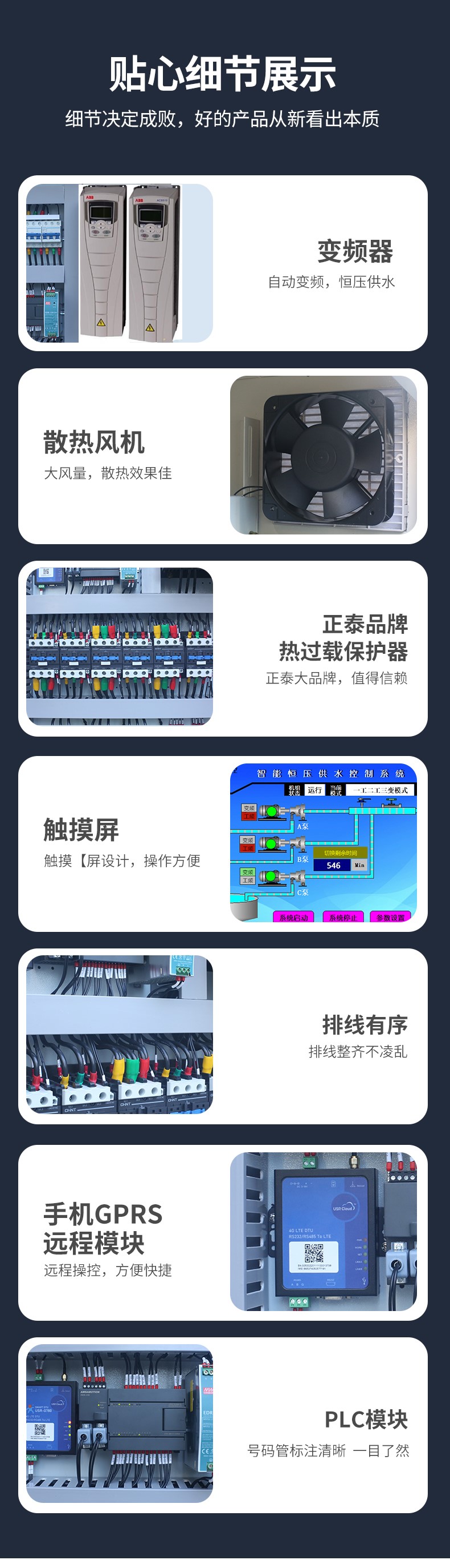 采用閉環(huán)控制技術(shù),系統(tǒng)能實(shí)時(shí)監(jiān)測(cè)管網(wǎng)壓力并與設(shè)定值對(duì)比,自動(dòng)調(diào)整輸出頻率,使壓力波動(dòng)控制在±0.2bar范圍內(nèi),提升了供水穩(wěn)定性與工藝質(zhì)量 。